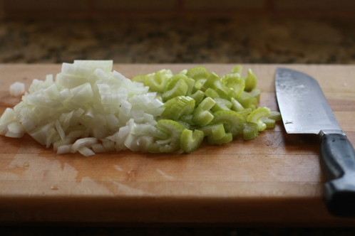 Prep the vegetables by chopping up the onion and slicing the celery. I used half of a large onion (or a whole medium) and two stalks of celery.