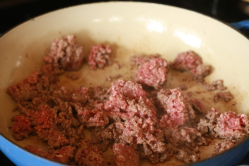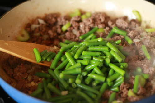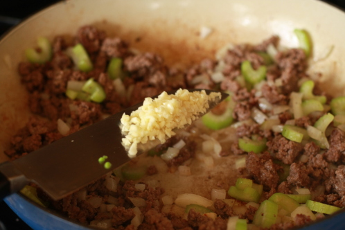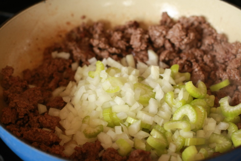 When the hamburger is well browned add onion and celery to the pan. Cook for a couple of minutes, stirring often until the onions start looking translucent.