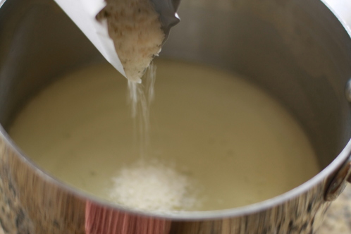 Add 1/4 cup of milk. I like 2% or whole milk in my Shepherd Pie, but these days I never have more than 1% in our home. To make up for the whimpiness of low fat milk, I often substitute a little of the milk for half/half. Reduce the heat to medium low for a few minutes to simmer while you prepare the pan.