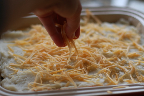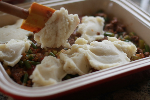 Now for the top. Dab large spoonfuls of mashed potatoes all over the pie.