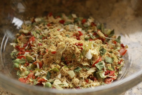 There’s the dry dip in a large bowl. You need to make this dip at least two hours ahead to give the dehydrated vegetables time to soften up and the flavors to merge.