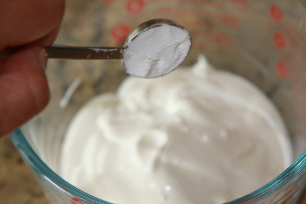 1. Add baking soda to sour cream. Mix together and set aside.