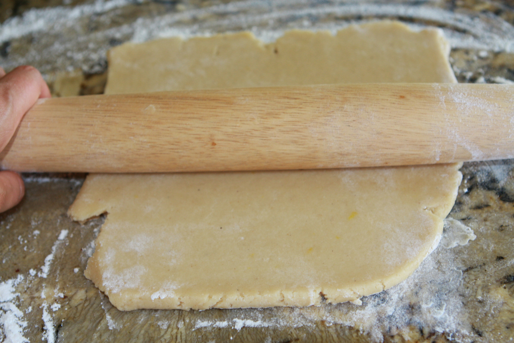 8. Dust your counter or board and rolling pin with flour. I learned this tip from Martha Stewart… she says to always roll in the same direction and then just turn your dough. This keeps it loose on the board. I start rolling, lift the dough to turn the direction and dust a little more beneath it. I turn and dust one more time… by this point I can roll without it ever sticking. Roll according to how thick you like your cookies 1/8″ to 1/4″ thick.