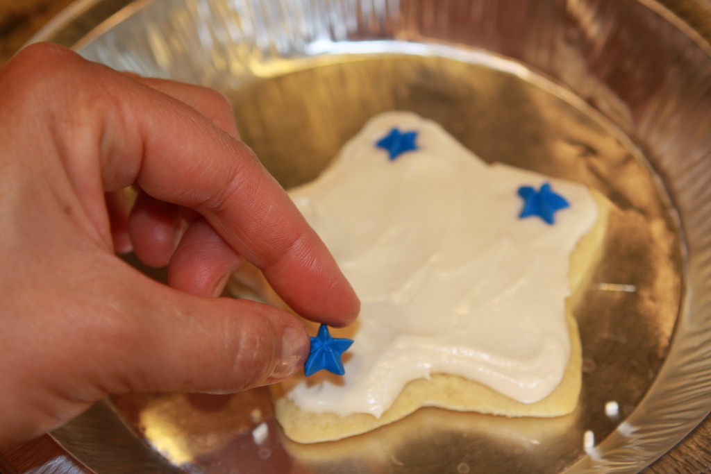 Sometimes Aunt Karen makes her frosting so that it’s more of a glaze and just dips the tops, they dusts them with colored sugar, for a very quick and easy decoration.