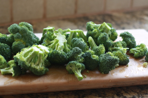 Start with 2 lbs. of firm fresh broccoli.  I just weigh it at the store when I’m buying it.  Chop it all into bite-sized pieces.