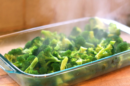 Steam the broccoli until it turns bright green and is just barely fork tender.  Don’t overcook!  I hate mushy broccoli!  Besides it will be cooking in the oven for 30 more minutes.