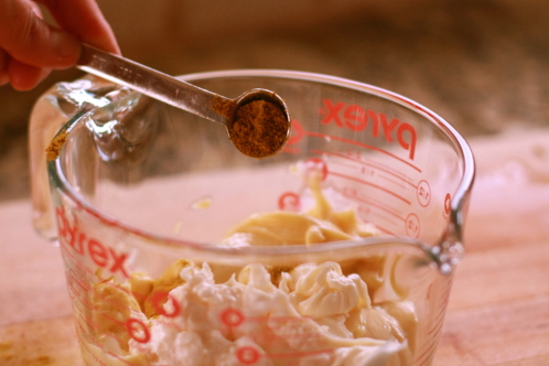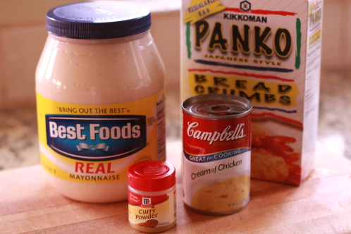 Now for the topping.  You’ll need one can of Cream of Chicken soup (this is SO a casserole), mayonnaise, Curry Powder (yeah!), salt (not shown) and breadcrumbs.