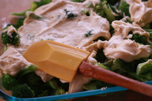 And spread it as evenly as possible over the top of the broccoli.  Don’t stir them together… just spread it out like frosting.