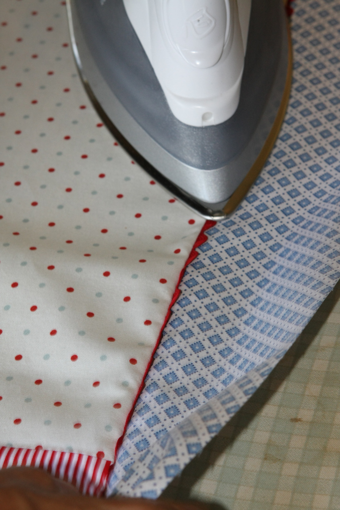 1. Using a scant 1/4 inch seam, piece together the blue to the white fabric sewing the 13 1/2″ edges together. Piece together the red to the white. This creates the center piece. Press seams toward dark fabric.