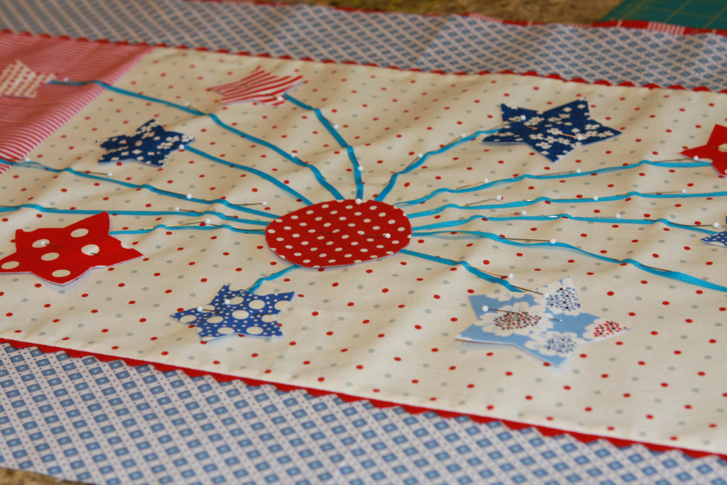 7. Pin circle, stars and ribbon into place.