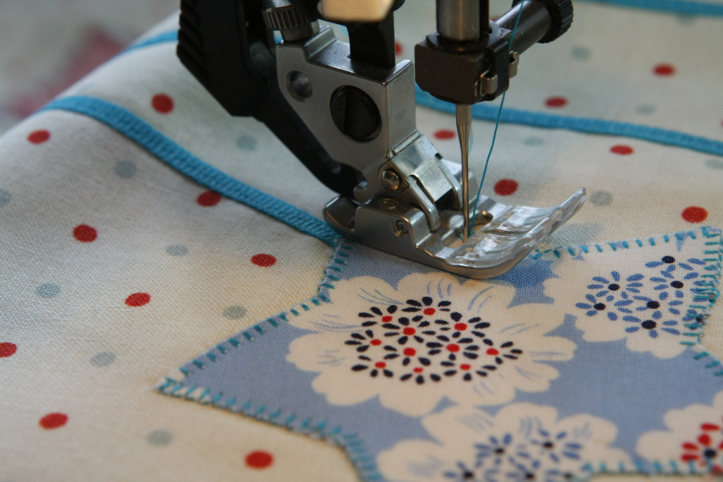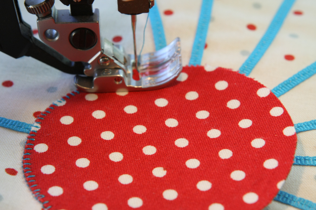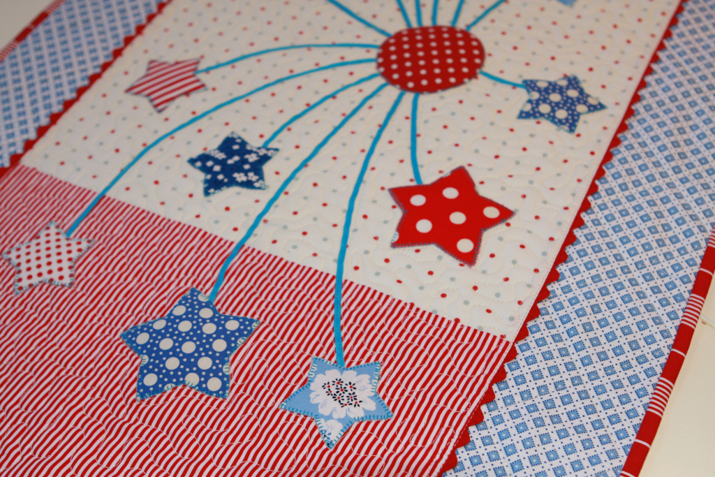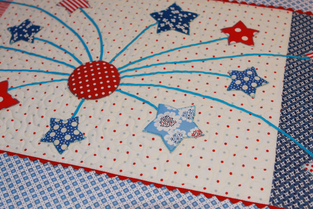 9. Stitch around circle and stars using decorative stitch. (I used a small blanket stitch. My mom would never consider doing anything but applique! Do what suits you.) Press well. 10. Layer top, batting and backing and quilt. I am lucky enough to have my very talented Aunt Karen who quilted it together beautifully on her large quilting machine. Her company is called Stitched in Time (which she did!) You can also quilt by hand or on your sewing machine.