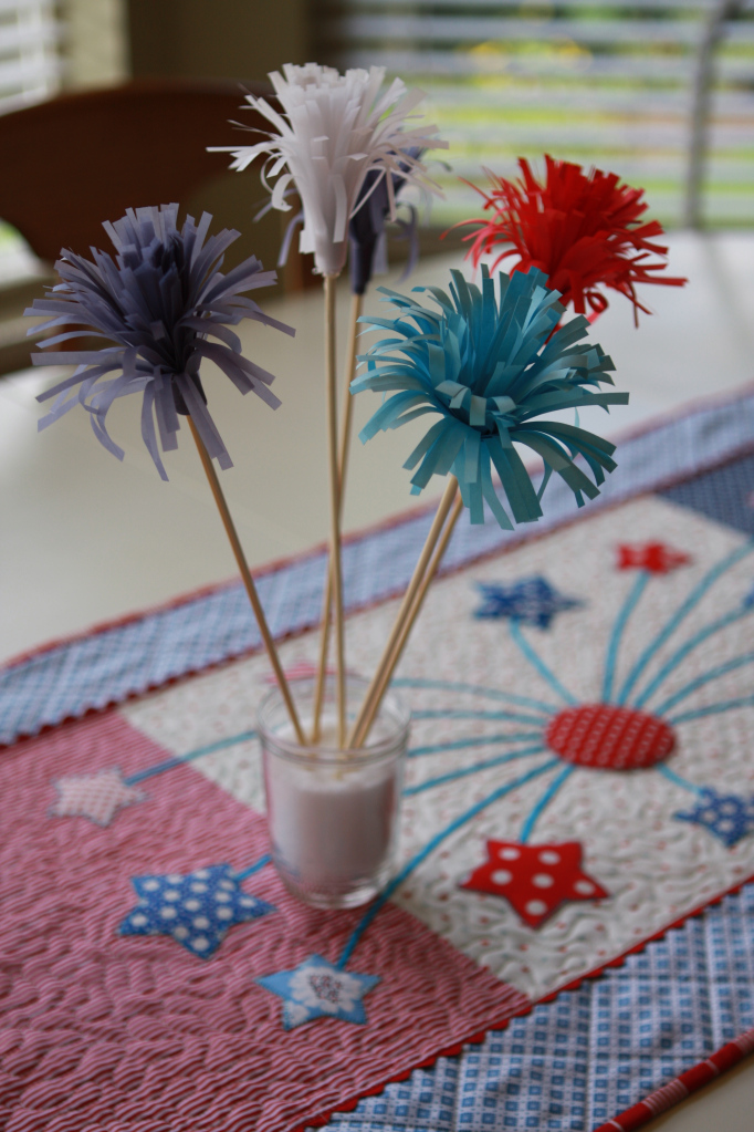 Just a note about making the bamboo skewer fireworks from Martha Stewart…. I had some trouble finding colored vellum. I guess that’s what you get when you live in a small town. I did find the dark blue(ish) vellum and white, but for the red and light blue I just used colored printer paper from the copy shop. I thought the printer paper was easier to work with and looked better. Plus it was a lot cheaper than vellum. I used 8.5 x 11 sheets of paper, cut in to 3′ strips lenthwise. I laid a strip of the double stick tape down, laid another strip right on top, and then cut the 1/8″ cuts through both sheets at once (leaving about a 1/2″ at the bottom to wrap around the skewer.) Then I laid another strip of the tape along the whole length and rolled it up. I used the edge of my scissors to curl the outside strips.