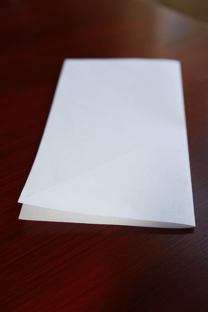 Start by cutting an 8 1/2″ x 11″ sheet of printer paper into a square- 8 1/2″ x 8 1/2″.  Cheaper, thinner (light weight) paper is actually best for this project.