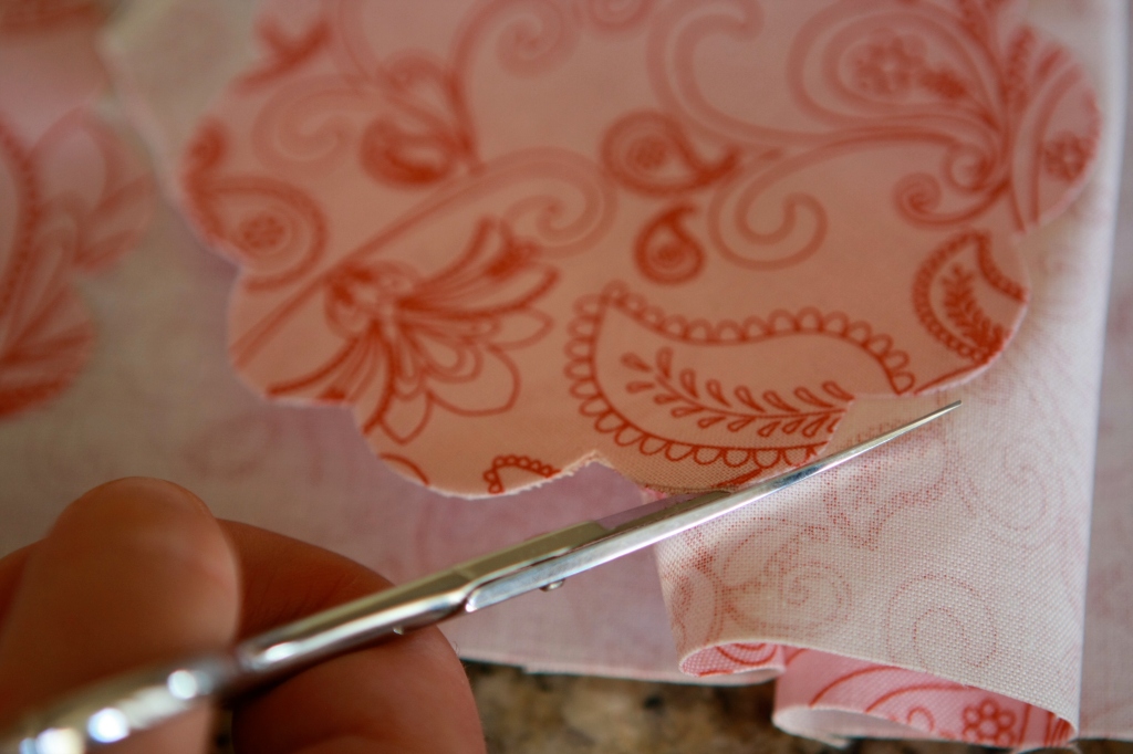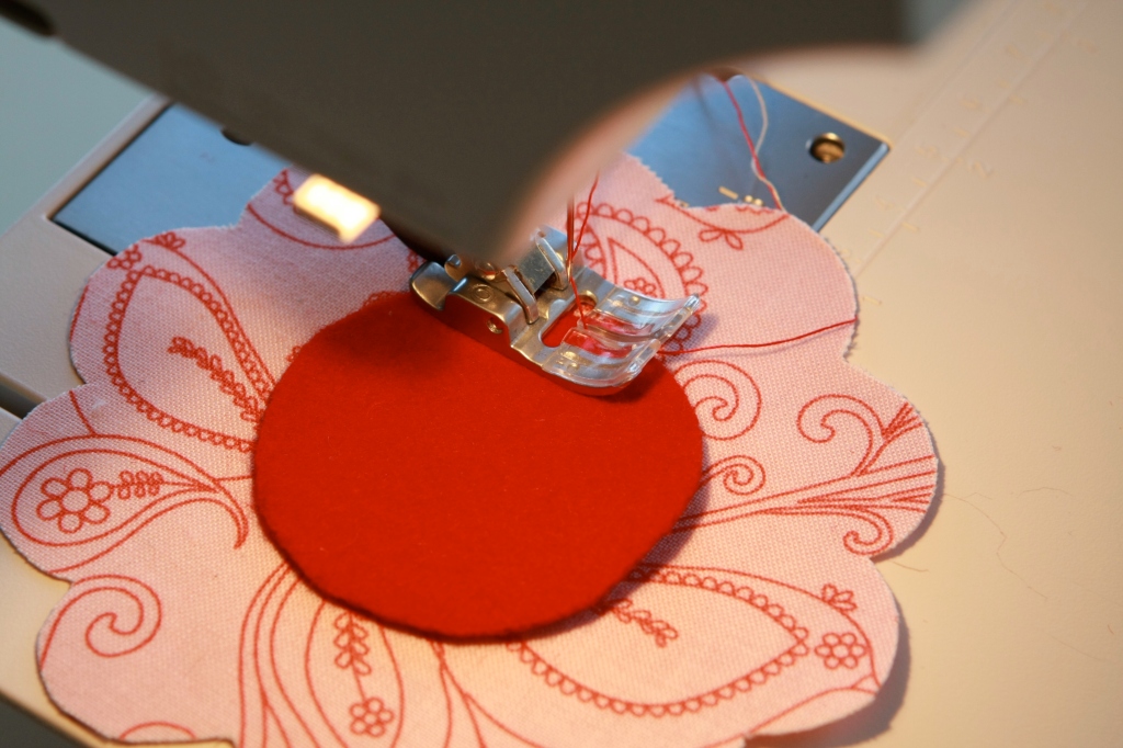 9.  Center largest circle onto largest flower and stitch around edge.  This may be done on the machine or by hand.