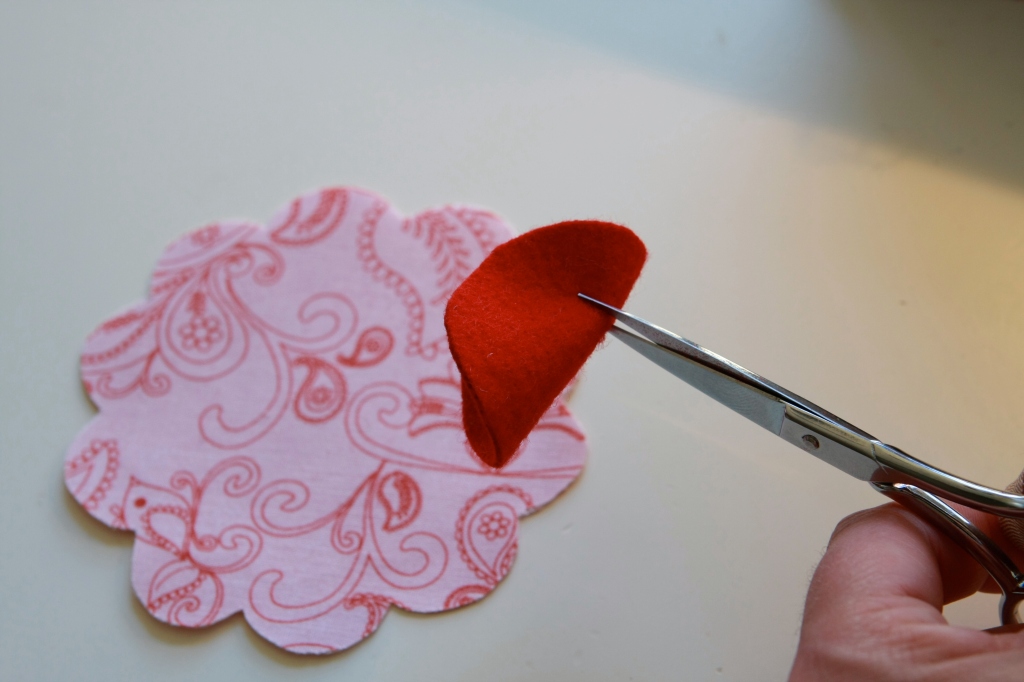 7.  Cut out three circles from the felt.  For the first circle, I used the top of a shot glass.  Next flip it over and trace the smaller bottom of the glass.  The last circle was about the size of a penny.  So you are basically going from large to small circles.  You can usually use a pencil to trace the circles onto the felt.