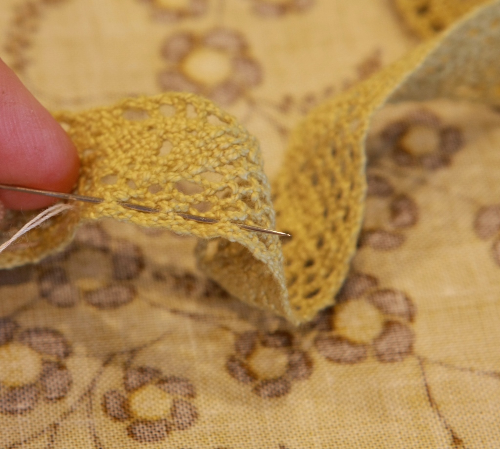 You can also use a layer of lace before you sew on the button.  Using long thread, I weave the needle in and out of the bottom of 7 inches of lace.  Then pull both ends of the thread and gather the lace in tight.  Tie the thread into a knot.  IMG_7816