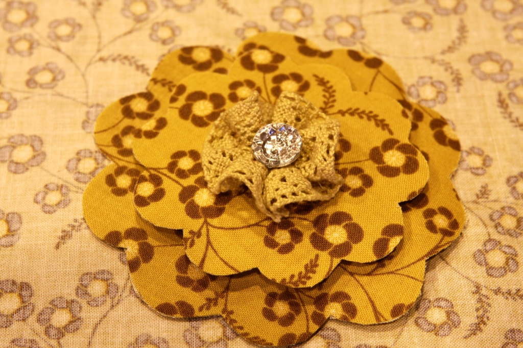 I used one less layer of flower for this flower pin. I stitched the lace to the flower below it, before securing the button.