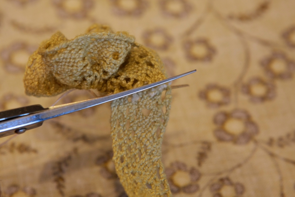 Trim off the end of the lace.  I used my still attached needle to weave the two ends of the lace together.  This is an optional step.