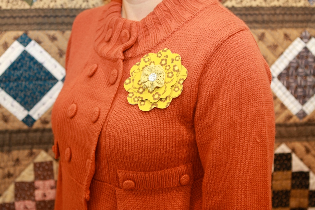 These flower pins make a fun, easy and thoughtful handmade gift.  If you prefer one out of ribbon, don’t forget the tutorial for ribbon flower pins I made in the Spring… they would be wonderful in reds, greens, silver or golds for the Holidays.