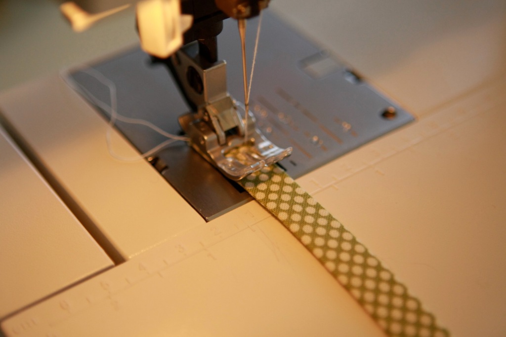 Now stitch all the way around the headband. I’ve moved my needle position as far as it will go to the right, for my Pfaff it is “6”. And I am stitching about 1 millimeter from the edge of the fabric.