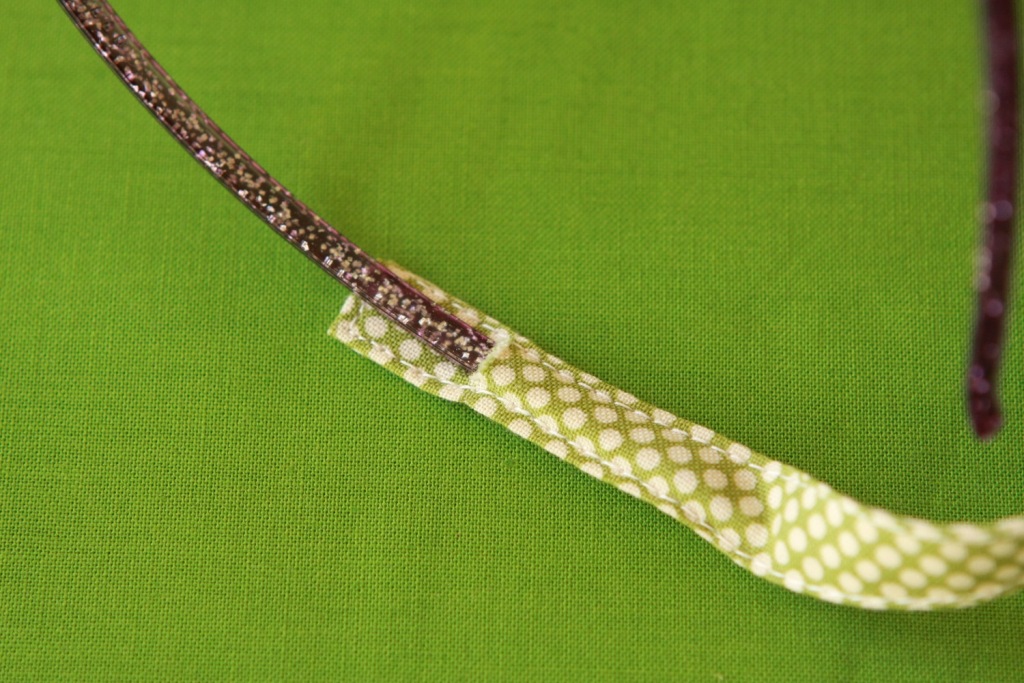 Now slip your headband on in. You may need to stretch the fabric just a bit to get the end of the headband in all the way.