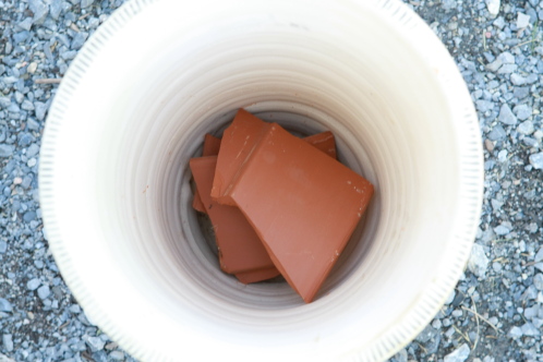 When a terracotta pot breaks, I save the broken pieces. No, I’m not being overly sentimental. It’s because they are useful. I always place a few pieces of broken terracotta over the drainage hole of my pots. Place them so they allow drainage and cover the hole at the bottom of the pot. This aids drainage, keeps the dirt from running out of the pot when watering and takes up a bit of space that I don’t need to fill with expensive potting soil.