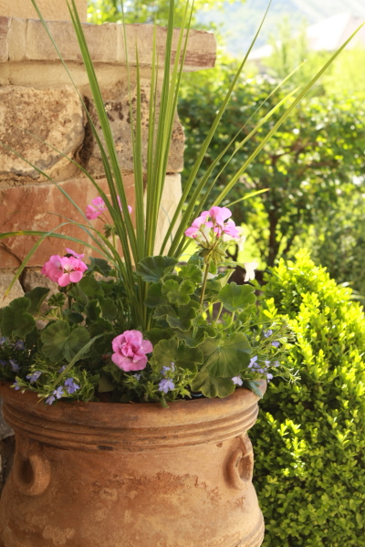 The pot in the photo could not be simpler. I’ve used Dracaena in the center, seed Geraniums and double Petunias for the round and full and Lobelia for the cascade. All of the plants were chosen, not only for color, but because they were economical.