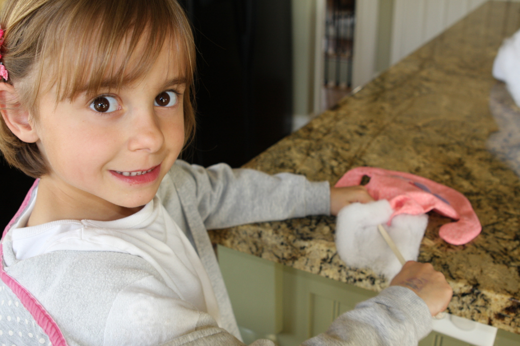 9. Use a chop stick to turn the dolls right side out. Then fill with a fiberfill stuffing. I didn’t have any, so I made do with batting. I let the girls do most of the stuffing, because they wanted to be part of making the dolls. The batting we used did leave the dolls a bit lumpy but the girls don’t care.