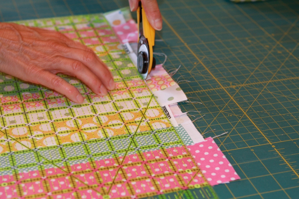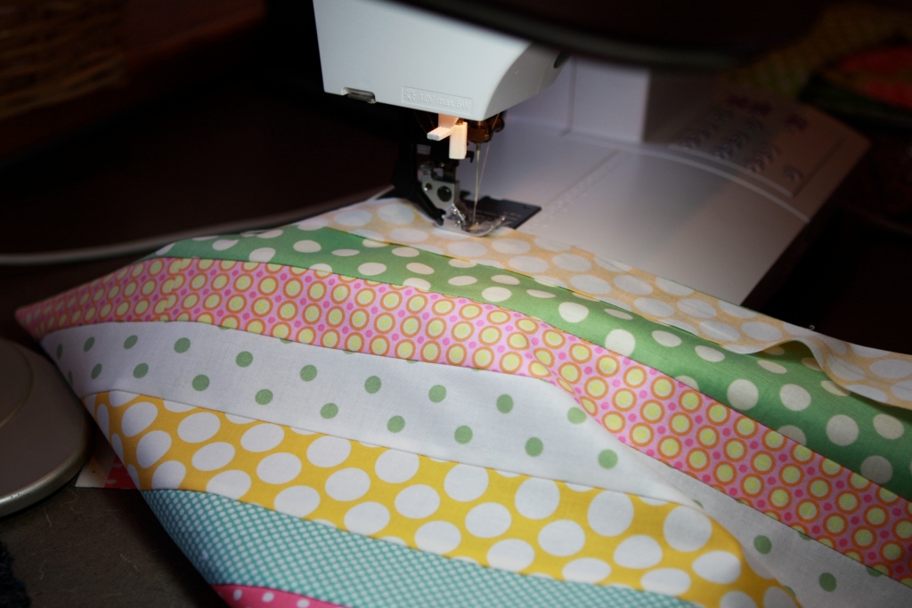 3. Using a 1/4 inch seam sew the strips together.  Don’t worry if the ends aren’t perfectly lined up.  As you sew each strip together press all the seams in one direction.  (Make sure to press each time you add a strip.)