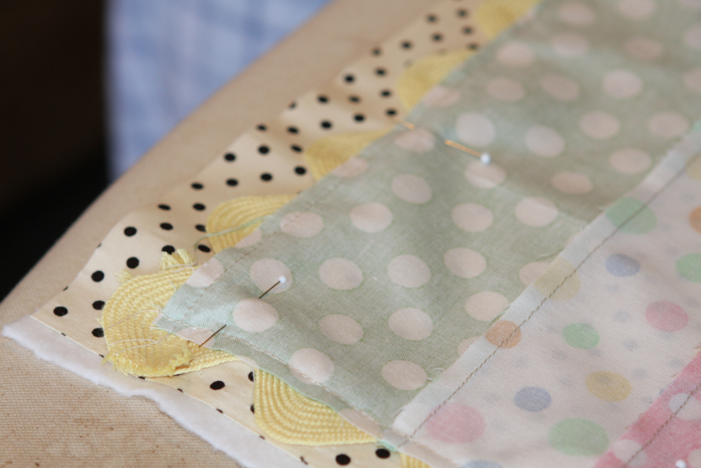 5. Working one side at a time pin the rickrack to the edges leaving it an inch longer on each end.  Crisscross ends and pin the next side until rick rack goes all the way around.