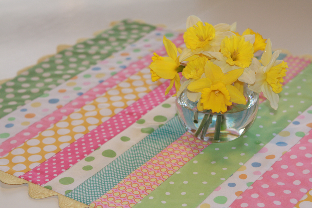 After making several quilts using polka dot fabrics, my Mom had some great scraps.  So we got together yesterday to “Use Them Up.”  The fabrics were mostly small pieces, so we had to be creative.  The end result was this wonderful table runner just in time for Easter.