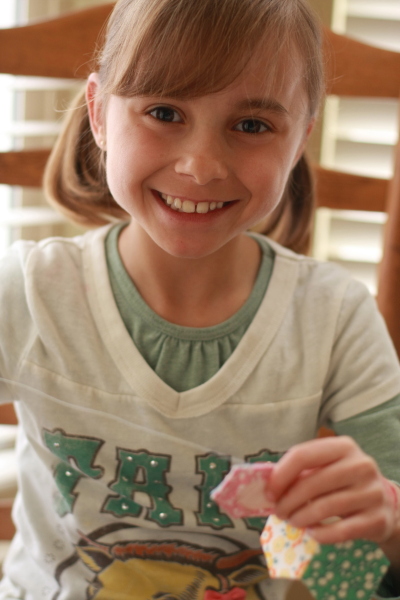 So in no time at all Emma was happily stitching together hexagons. And my new pillow will be a new quilt for Ruthie instead.