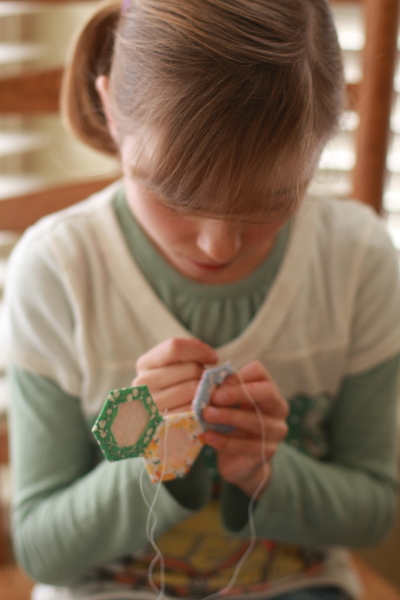 She still is learning how to stitch her hexagons around the paper pieces, but she can sew them together using a very neat little blanket type stitch.