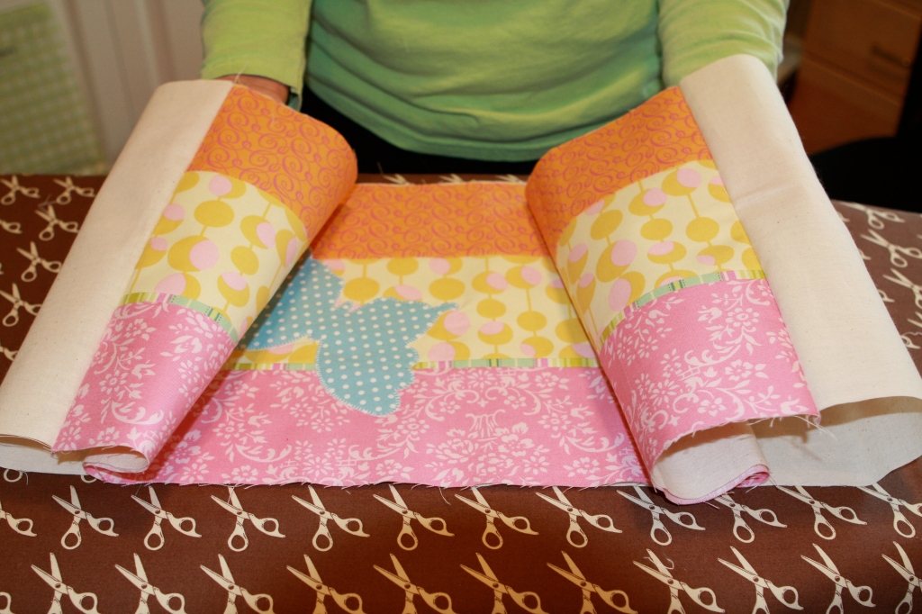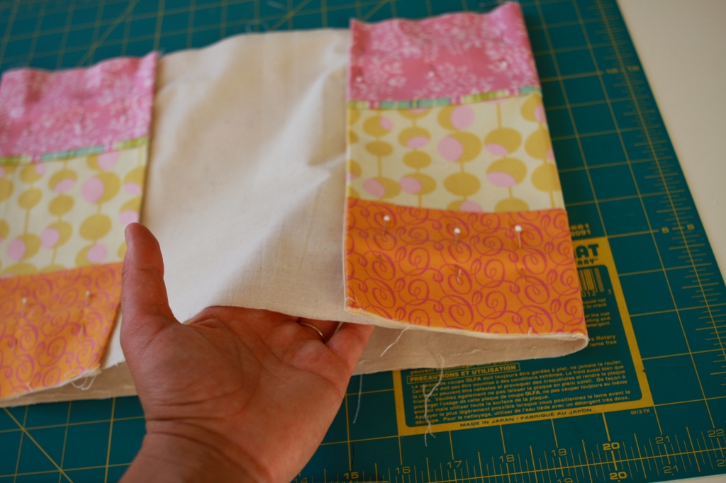 10. With right sides together, pin together the width ends of backing and pieced top.