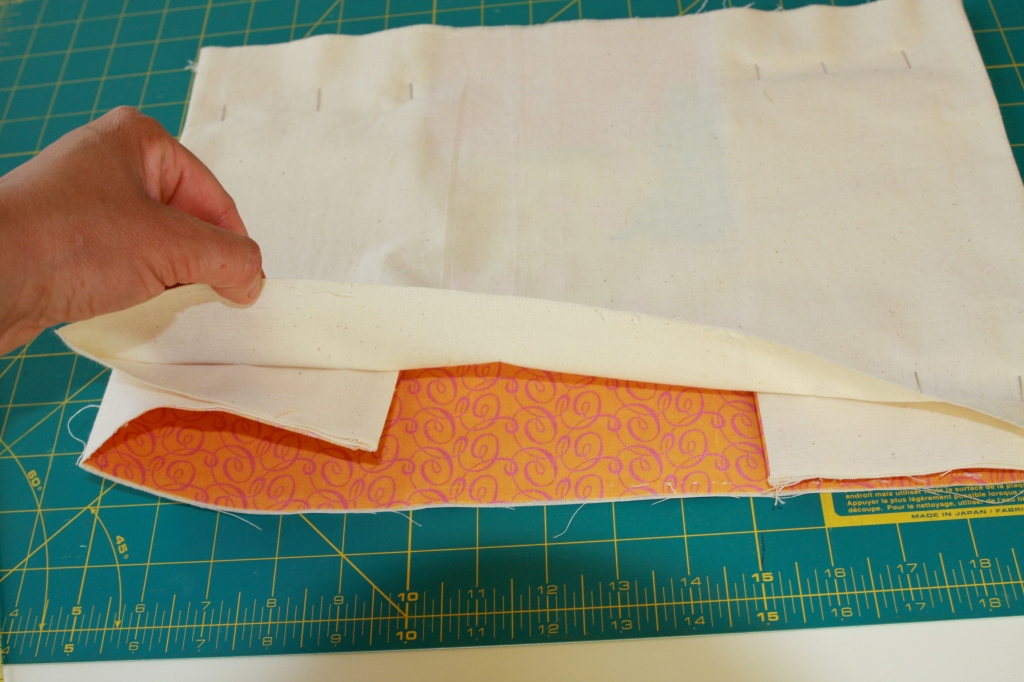 15. Using a 1/4″ seam stitch along the entire top. Stitch bottom as far as the flaps on each side, but leave the middle open to turn.