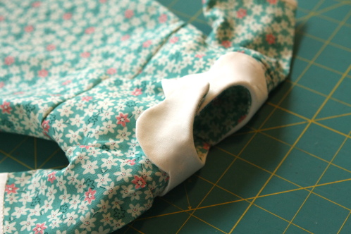 Next I had to add straight sleeves with a cuff. Again I modified the sleeves from the jacket pattern. Adding the cuff was as easy as adding as binding. The buttons I still need to sew on, but I think it looks sweet on the cuff.