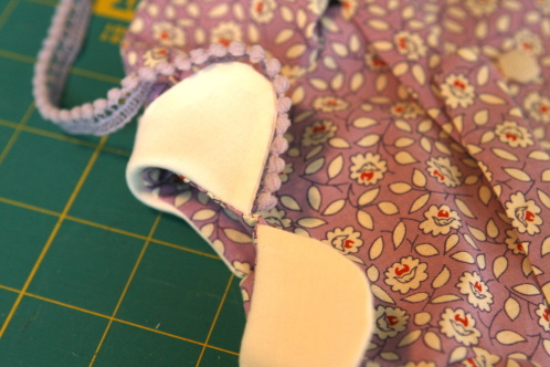 The first challenge to modifying the pattern was to add a scalloped collar. I started with the collar that belonged to the jacket on the pattern. I scaled it to work with the dress with the opening in the back and then used a my shot glass measuring cup as a round template for the scallops. It’s not perfect, but it worked. Adding the collar meant changing the way the bodice was put together, and luckily it came together easily.